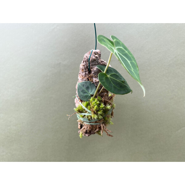 Epiphytic anthurium mounted and ideal for terrariums. The Anthurium can be hung in the terrarium, e.g. on the back and side walls, and requires high humidity. We recommend spraying the plant; if a sprinkler system is available, spraying is not necessary. It should be checked from time to time whether the roots need to be re-moistened. This Anthurium prefers warm temperatures and is therefore very suitable for rainforest terrariums.